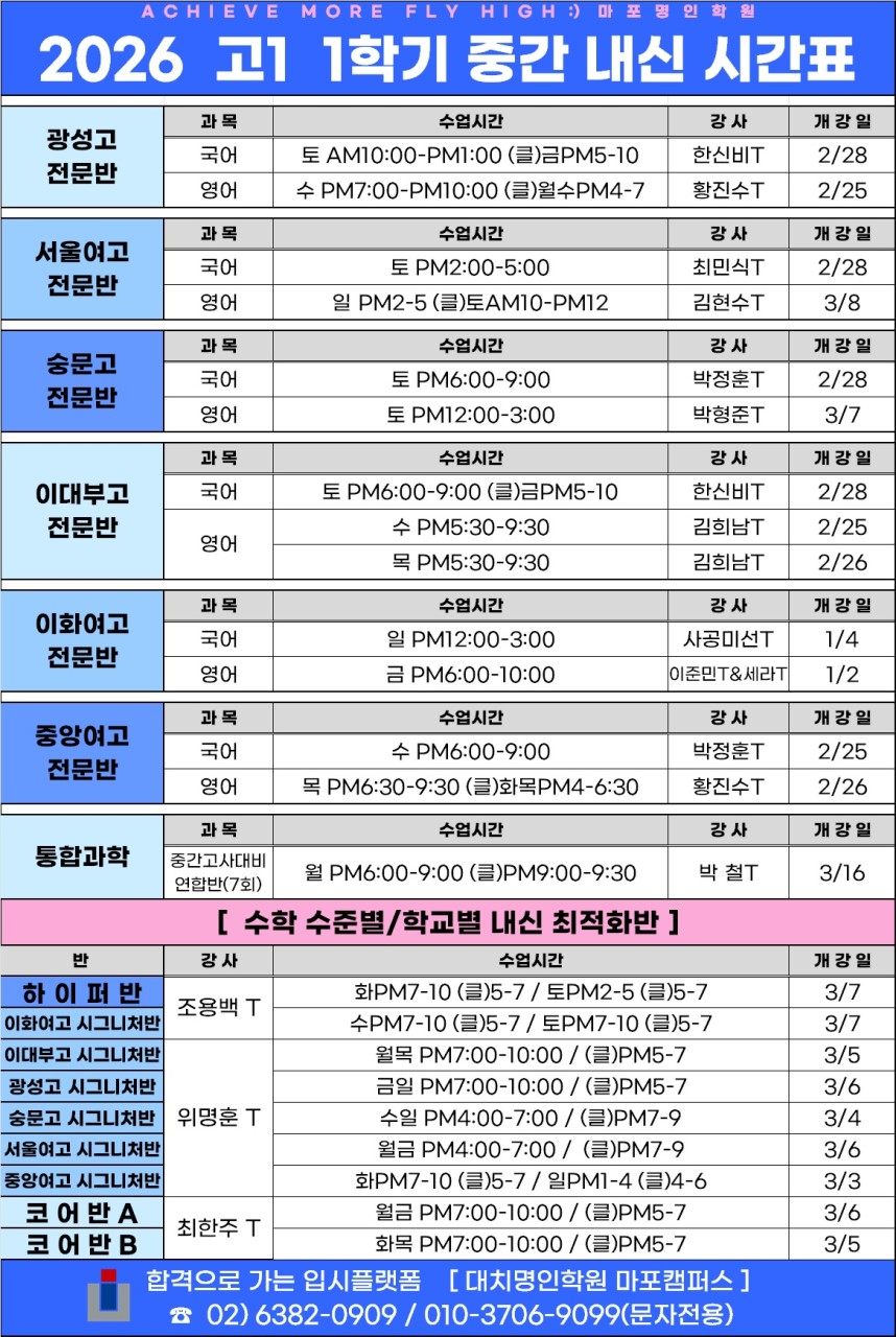1학년 1학기 중간고사 대비 학교별 전문반 내신 시간표