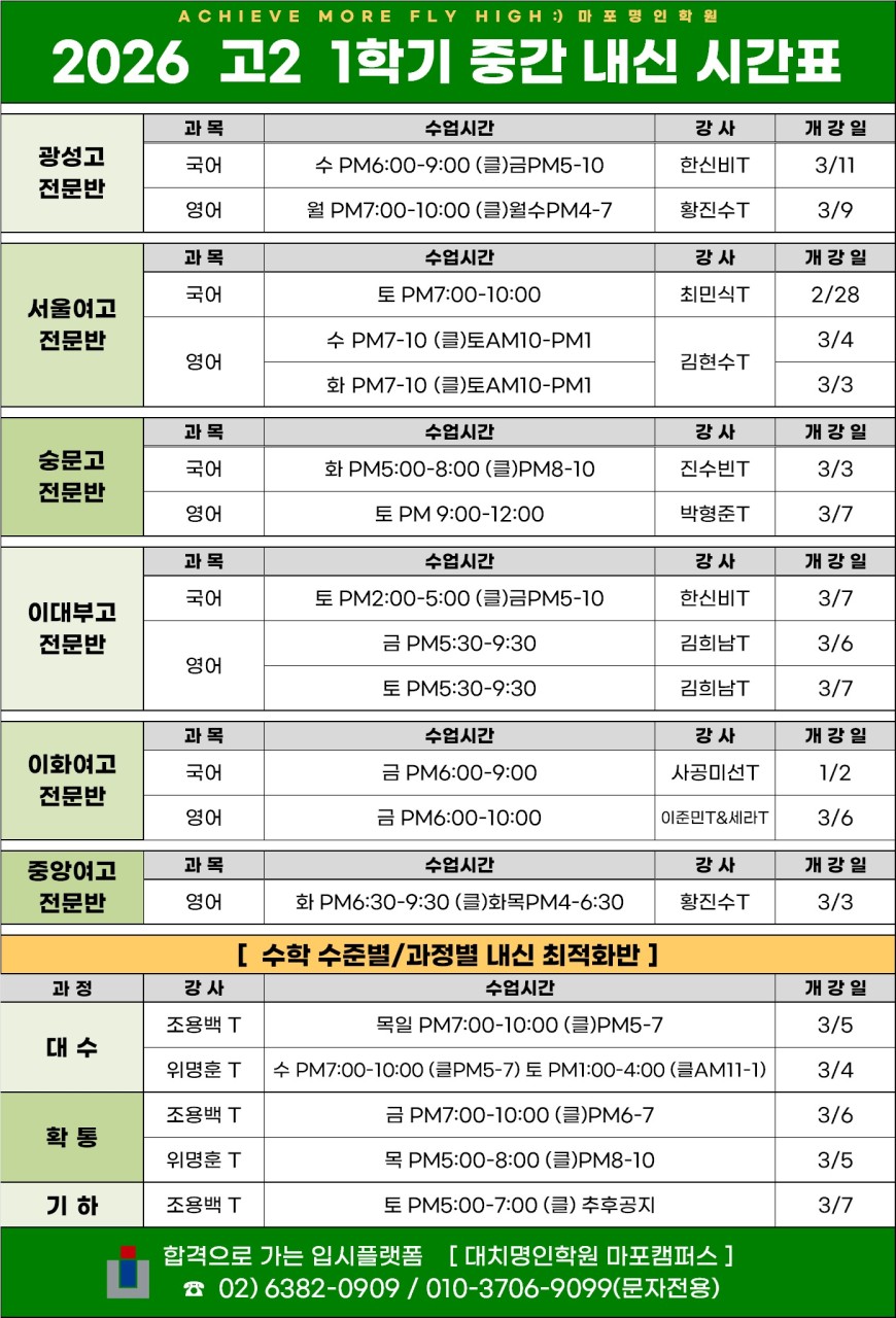 2학년 1학기 중간고사 대비 학교별 전문반 내신 시간표